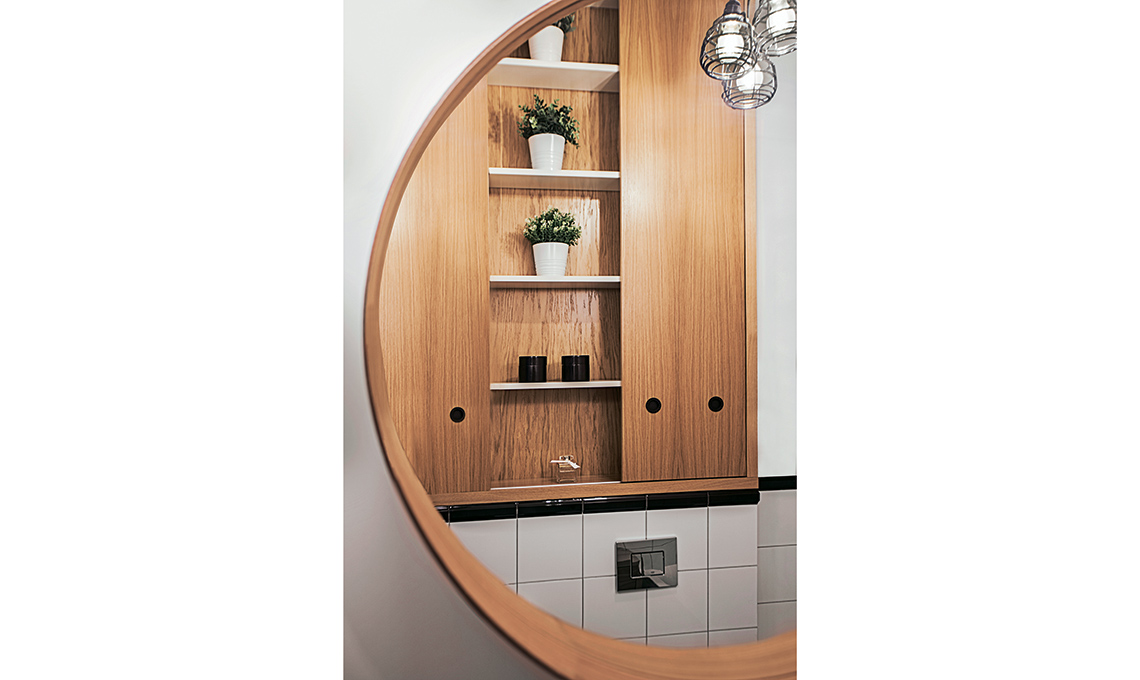 il look ci sono le piastrelle bianche che rivestono la vasca in muratura, profilate da un bordo in ceramica nero lucido, dall’effetto very vintage. Sono realizzati su misura, in rovere, il mobile sottolavabo e il pensile attrezzato con mensole a giorno.