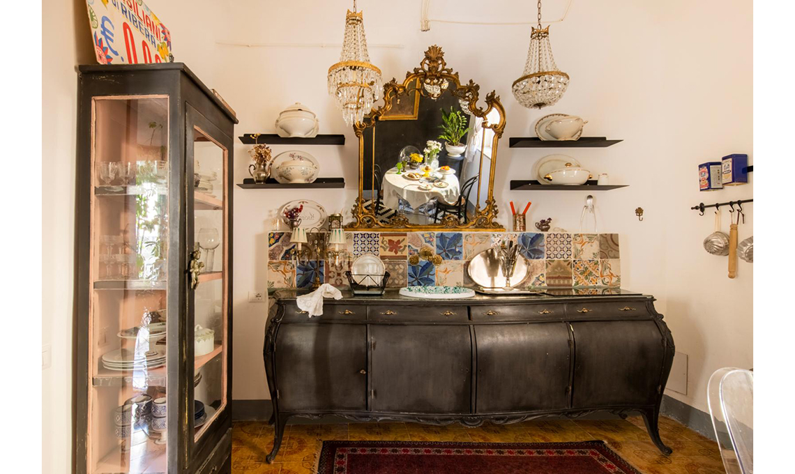 «Con l’idea giusta e una buona dose di fai-da-te, il buffet di recupero diventa un piano cucina attrezzato. Il tocco décor è dato dalla specchiera barocca e dalle cementine Liberty».