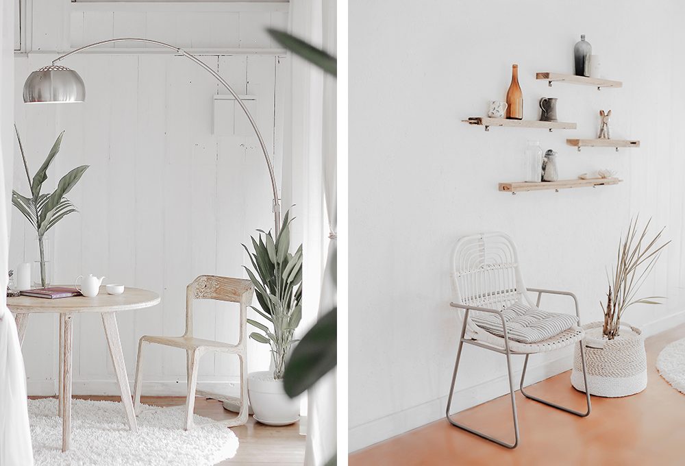 La semplicità qui va a braccetto con l’originalità. Su uno sfondo tutto bianco, la padrona di casa ha inserito elementi a sorpresa: il design e l’arte si integrano con pezzi d’arredo che richiamano la natura e il risultato finale è piacevole e inaspettatamente chic.