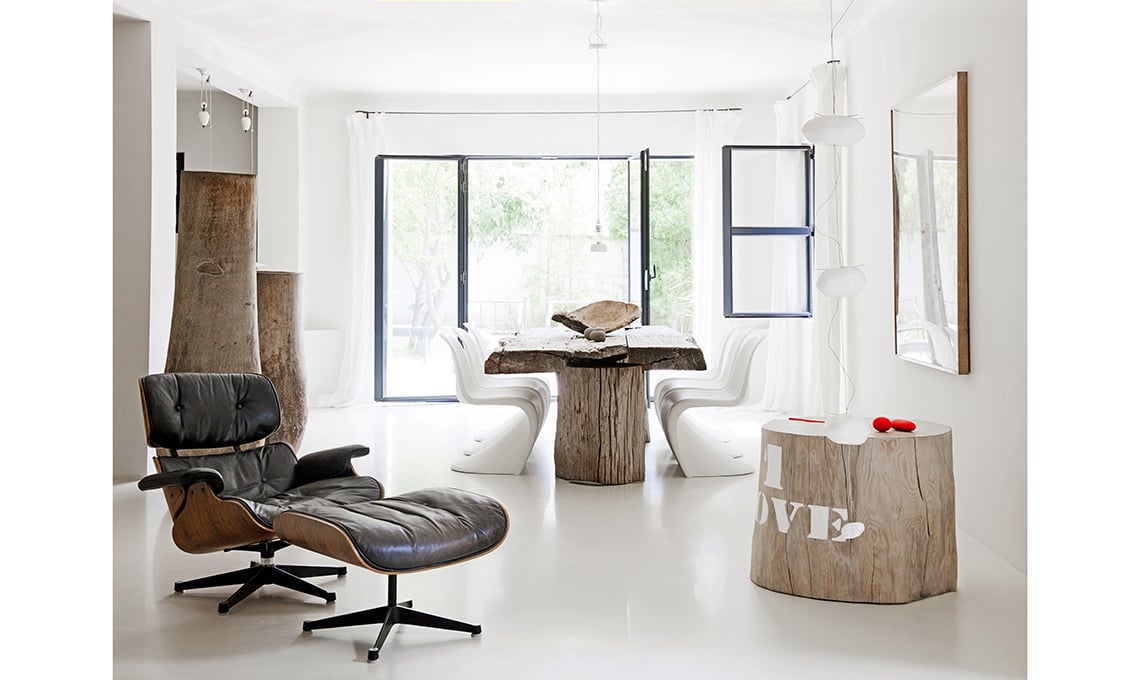 Attorno al tavolo, sedie Panton, by Verner Panton [Vitra, cm 50x61x83h da €285]; sopra, sospensioni Johnny B. Good [Ingo Maurer, ø cm 10 € 554]. Ceppo ‘1 Love’ di [Roxane Beïs], luci Points de suspension [Céline Wright, cm 50x35x 250h€672], poltrona Eames Lounge Chair + poggiapiedi Ottoman [Vitra, rispettivamente cm 84x85/91x84h e