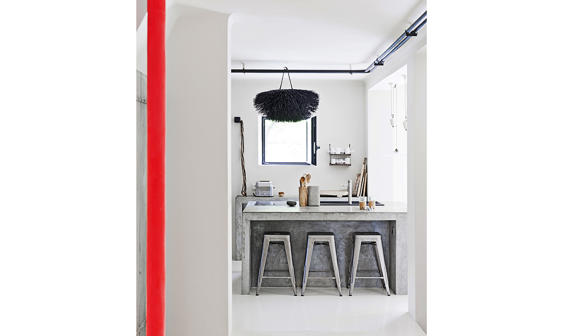 Sotto l’isola, tre sgabelli Tabouret H, design Xavier Pauchard [Tolix, in diverse altezza, da € 174]. Sullo sfondo, il nuovo tostapane Toaster 2 [Magimix € 200]. Se cerchi una sospensione con saliscendi da cucina, un modello simile è Luke di [Rossini Illuminazione].