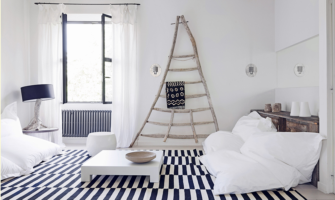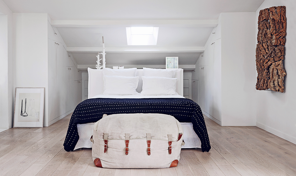 Vuoi ricreare un ambiente come quello nella foto? Scegli il letto rivestito Vandve [cm 160x200x 108h € 529], di [Ikea] come il copriletto black& white Lurvig [cm 100x150 € 20] e un baule in lino écru [Maisons du Monde, cm 77x48x51h € 529]. A terra, opta per un parquet di rovere chiaro come Sfarinato C30 della collezione Legni del Doge [Itlas].