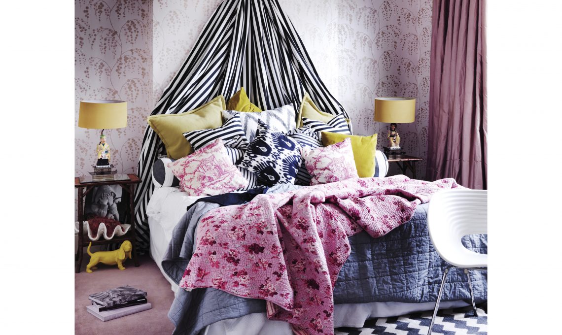Nella camera trionfano gusto e ironia, a cominciare dai colori: il grigio e il nero sono vivacizzati dal rosa antico e dal giallo ocra, all’esplosione di cuscini alle abat-jour sulle basi bric-à-brac. Allegria, morbidezza e intimità si fondono grazie a elementi inattesi: qua e là spuntano fiori e conchiglie, gufi, bassotti, dignitari cinesi, una vera... camera delle meraviglie! Anche tu sogni di dormire sotto un baldacchino di foggia Impero, come quello di Lucy e Dominic? Sdrammatizzalo con tessuto a righe b&n: un mix&match solo apparentemente senza regole.