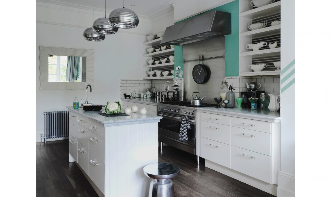 Nella maxi-cucina le forme moderne si sposano a quelle più classiche: vicino all’acciaio inox, sul nero, spicca una collezione di salsiere e coppe barocche e candide. Lucy ha personalizzato la sua cucina Bestå di Ikea, con un top in marmo e maniglie semi-trasparenti. E per fare luce sull'isola ha scelto le sospensioni Splügen Bräu, design Achille e Pier Giacomo Castiglioni, di Flos.