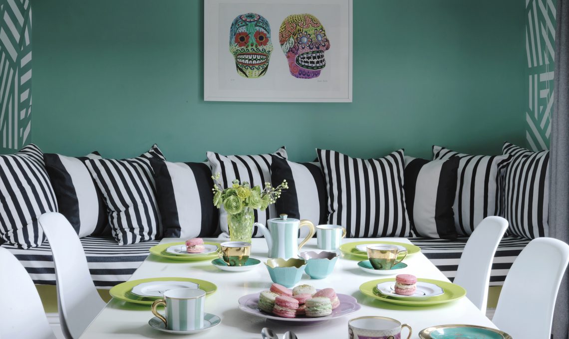 Formale e informale sono tutt’uno per Lucy che, per il tea time, offre deliziosi macarons alle sue amiche! Una tavola classica, rivisitata nei toni pastello, senza tovaglia e incorniciata dallo sfondo verde e dalle righe. L'idea da copiare? Il divano vicino al tavolo! Così, anche chi non sta gustando il tè può chiacchierare con i commensali. Basta una panca lunga e stretta, imbottita e con tanti cuscini.