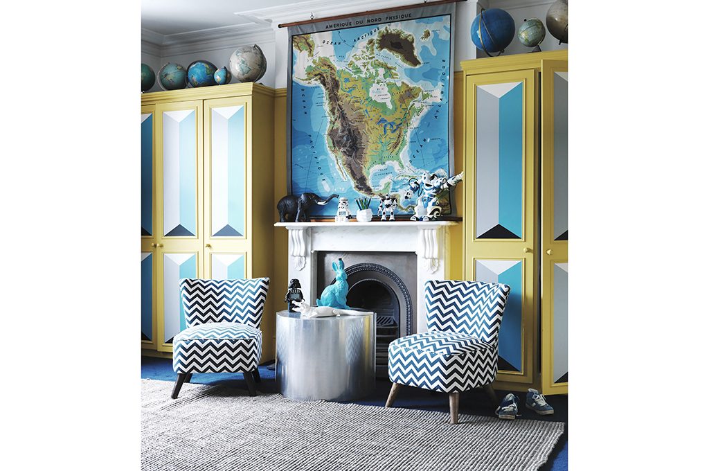 Nella camera dei figli, la carta geografica del Nord America ricorda gli anni vissuti in California. Proprio i colori della mappa hanno influenzato la scelta delle tonalità ocra e azzurro per tutta la stanza.