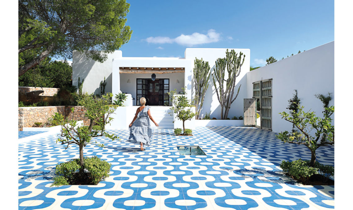Per vivere all’aperto come si usa a Ibiza, il segreto è questo cortile in piastrelle! Un’idea da copiare, insieme allo stile della villa, che riedita il bianco/blu in modo tutt’altro che scontato.