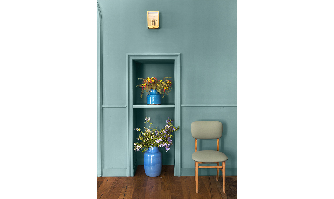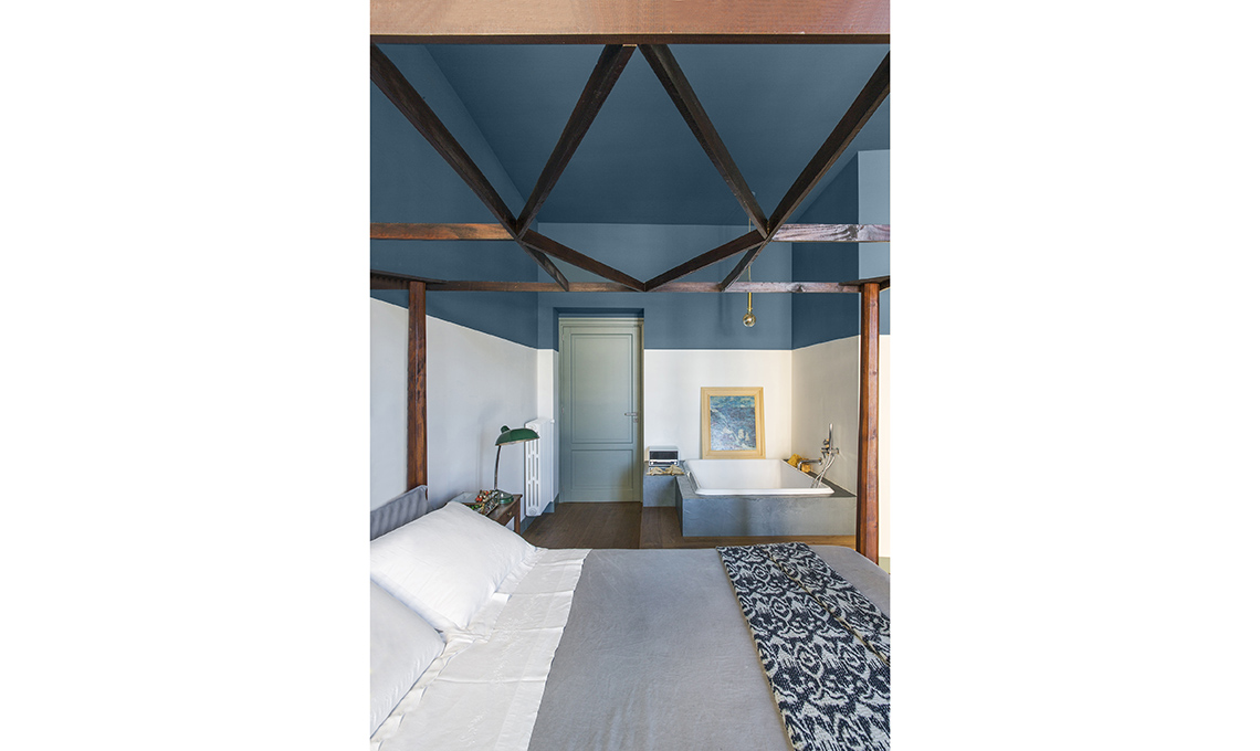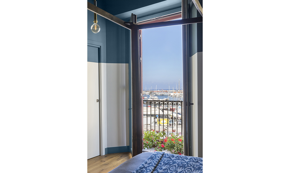 Le cornici di gesso su pareti e soffitto e il verdeblù che domina in tutta la casa. Nelle camera da letto si sovverte l’usuale ordine del bianco creando dei ’cappelli’ di colore: è come avere un orizzonte capovolto che riprende e continua la linea del mare che si inquadra dai balconi.