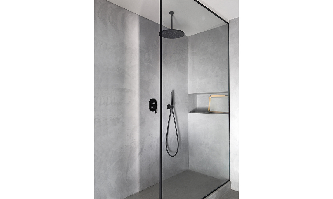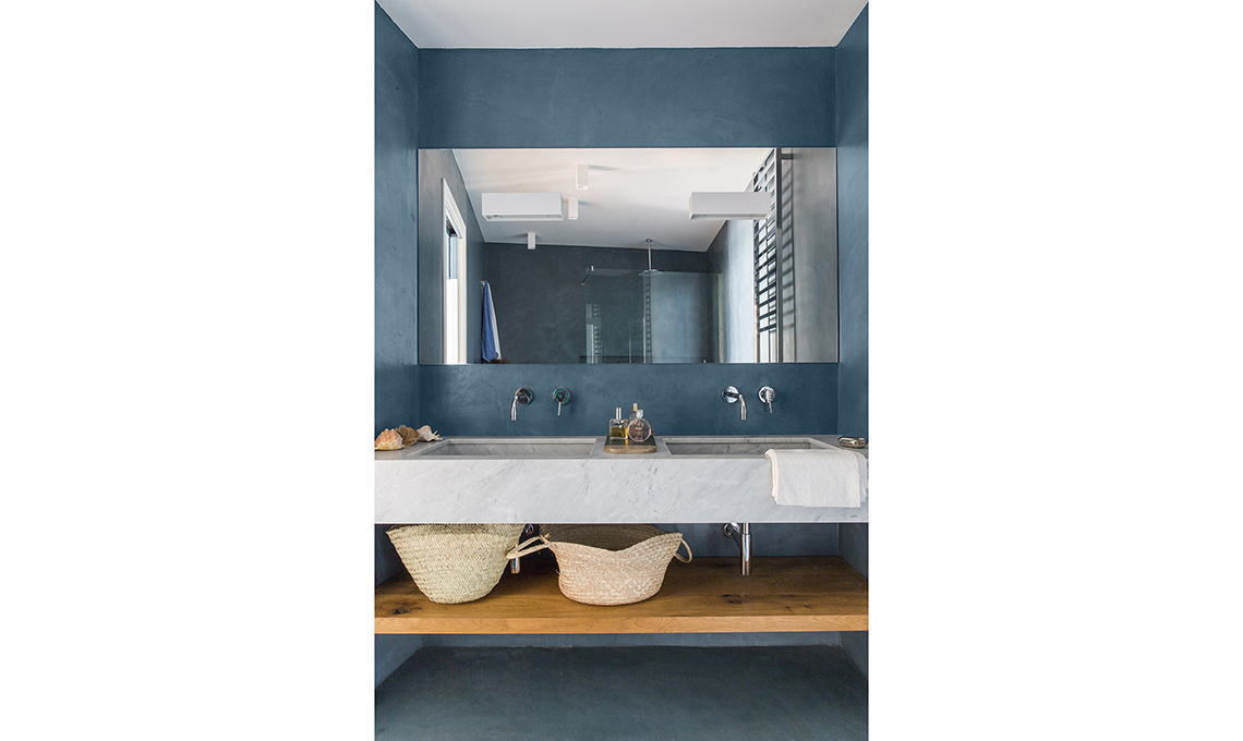 Il doppio lavabo nato dalla lavorazione di sbozzo del marmo di Carrara è il fulcro del bagno. Alfeo di Salvatori della coll. Fontane Bianche, disegnato da Elisa Ossino, è ispirato all’omonima, ‘scultorea’, spiaggia sicula.