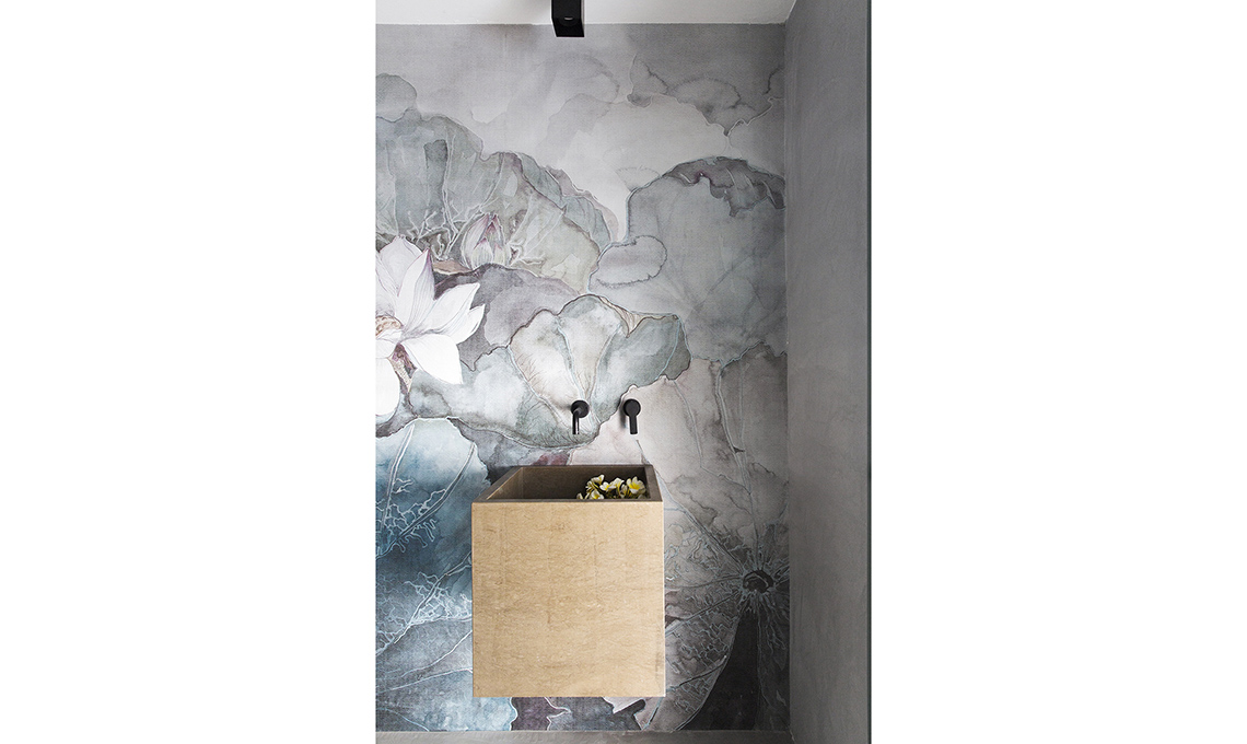 La carta da parati è Niveum della coll. Wet System 2016 [Wall&Decò], ma se sei in cerca di altre ispirazioni simili, ci sono le coll. Bathroom 17 e Bathroom 18 di [LondonArt] per ambienti umidi. Il lavabo è un pezzo artigianale in marmo grigio di Fossena; la rubinetteria con finitura nero opaco puoi trovarla nella linea Nostromo [Fantini].