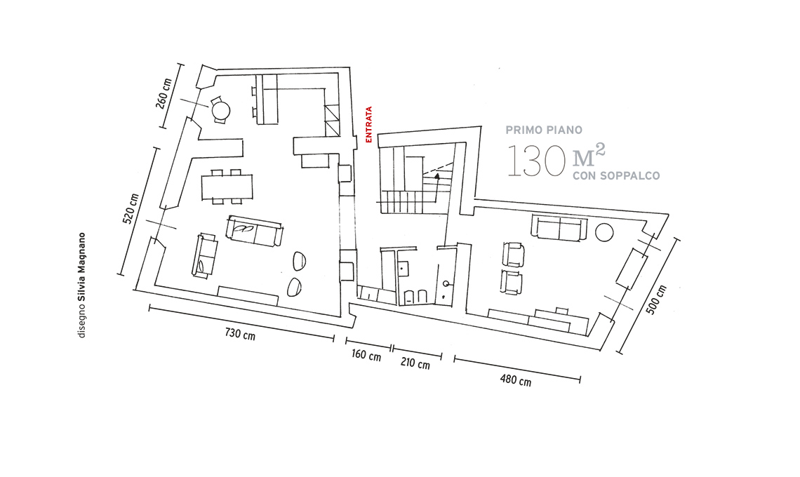 Per sottolineare l’impianto decorativo del salone sono state applicate nuove cornici di gesso che riecheggiano l’antico sfarzo del piano nobile. La libreria vintage, al centro, dà il ritmo alla zona conversazione.