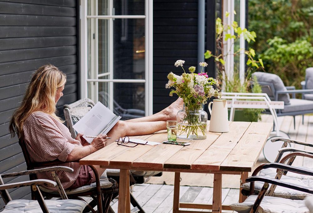Hoddebo House ha una superficie ridotta, ma è circondata da un grande deck in legno che diventa un’estensione open air del living. Per sottolineare la continuità tra esterno e interno, la padrona di casa ha sistemato il salotto accanto alla portafinestra.