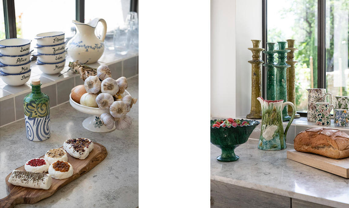 Le piastrelle, delle tipiche zellige marocchine, sono state posate e stuccate direttamente sul piano di lavoro dopo l’installazione della cucina. Si evita così l’antiestetica alzatina. Brocche [Casa Lopez].