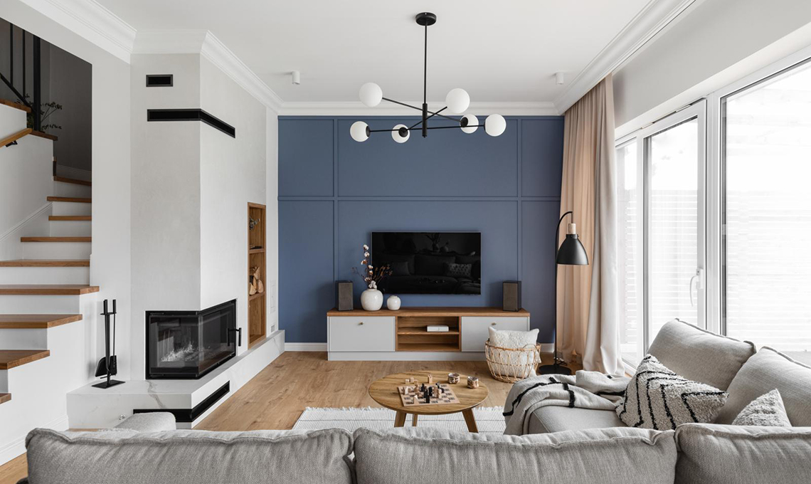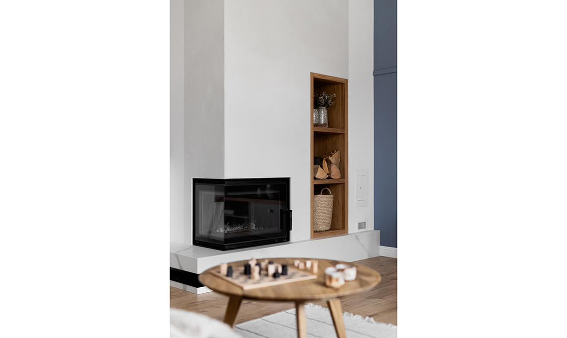 Colpo di scena nel living: la pennellata indaco della parete, visibile anche dalla zona pranzo, rompe la monotonia dei toni neutri e dà carattere all’ambiente! Anna e Joanna hanno organizzato lo spazio intorno a due punti focali: la televisione a muro e il camino minimal che, grazie al vetro angolare, si può vedere da ogni punto del divano. Ricorda che, per poter usare i camini anche nelle Regioni italiane che pongono restrizioni, è necessario installare apparecchi che abbiano ottenuto quattro o cinque stelle secondo la certificazione rilasciata da organismi autorizzati come IMQ.