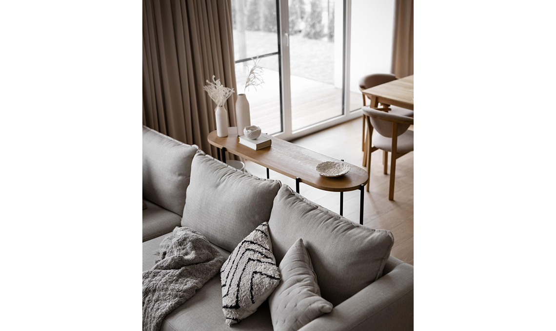 Qui la bellezza del panorama che si ammira dalle vetrate ha ispirato uno stile tutto a tinte neutre, che le progettiste sono riuscite a rendere accogliente e personale scegliendo materiali che portano la natura negli interni, come il legno di quercia del parquet, e modulando le texture (si vedano i lampadari in paglia a le belle tende drappeggiate).