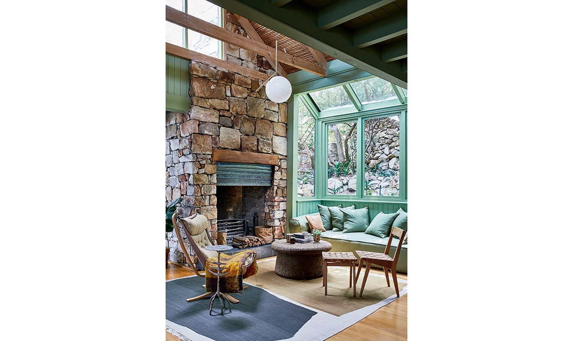 La casa, disposta su tre piani, ha due camere da letto: una al livello più basso e una in mansarda, sotto il soffitto a falda rivestito di canne che, insieme alla pietra e alle boiserie di perline, crea un esotico mood ‘capanna’. Gli arredi? su misura e in legno grezzo.