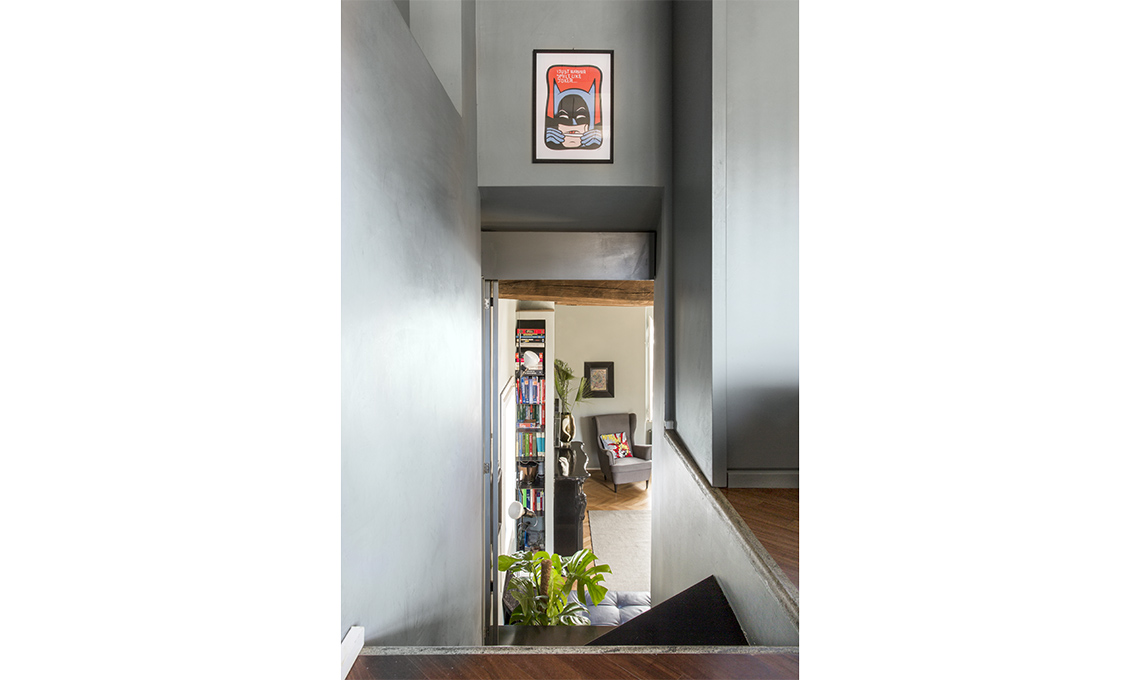 Pareti total grey e parquet a spina di pesce preparano la base perfetta per questo stile classico che trova la sua cifra (maschile) in due materiali forti e onesti: il marmo, sempre scuro e statuario e il ferro, piegato a fuoco per la scala, le porte e le librerie e che aggiunge una variante di sapore industrial. Per separare la cucina dalla zona pranzo senza interrompere la continuità di un soffitto ‘importante’ è stata inserita una porta scorrevole che rimane a vista grazie alla parete di vetro innestata tra la trave in ferro della porta e quella di castagno, sopra. Di grande impatto il contrasto tra materiali: il legno chiaro del soffitto, il vetro della parete, il metallo ossidato delle porte scorrevoli.