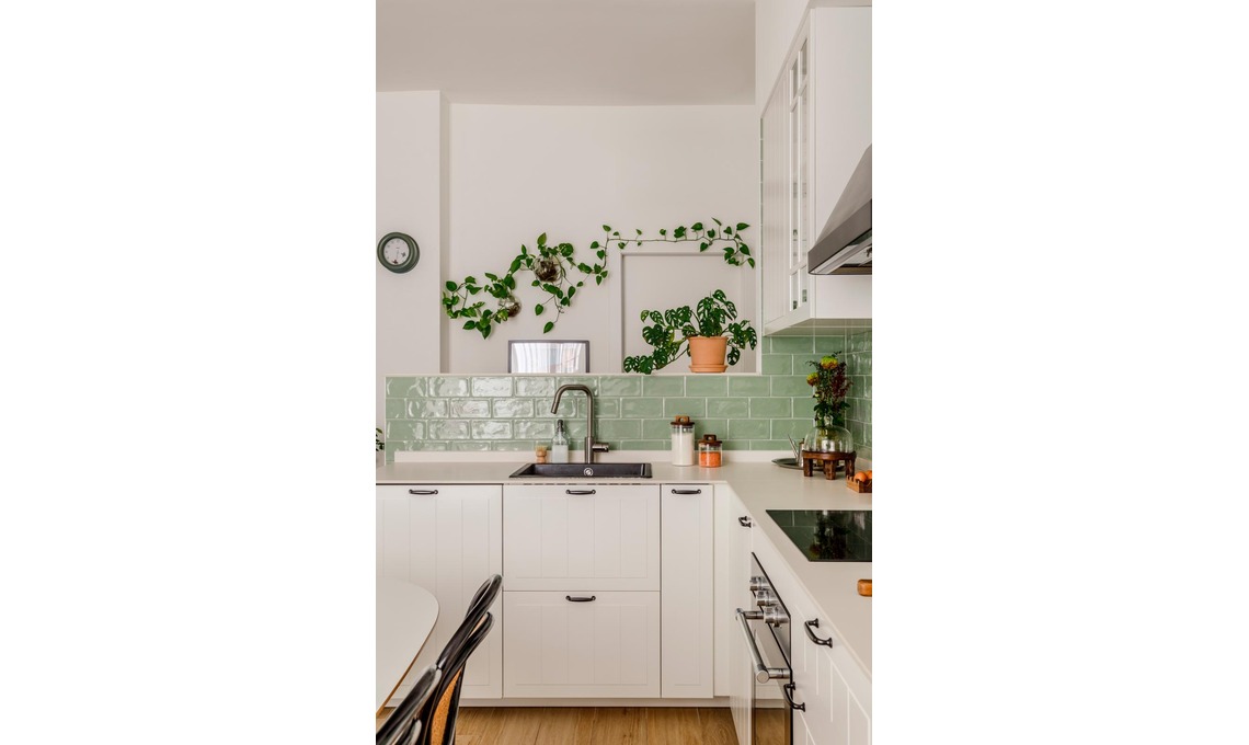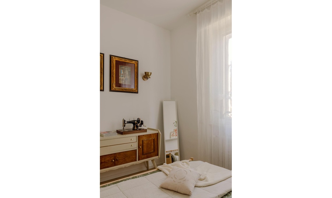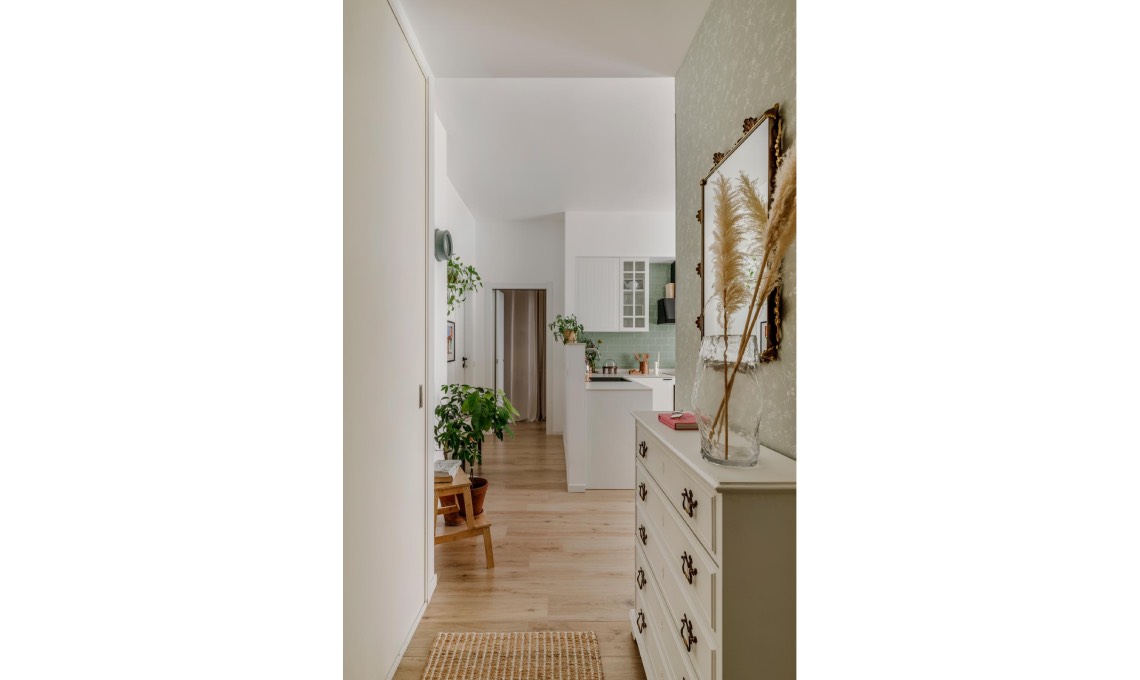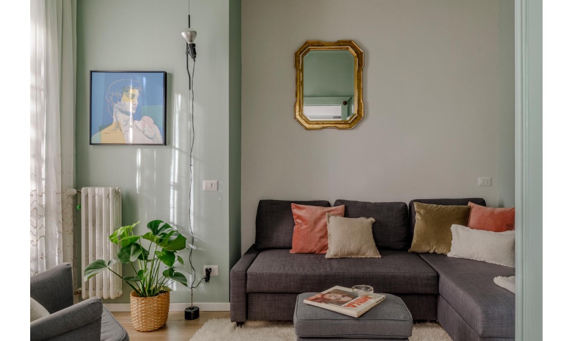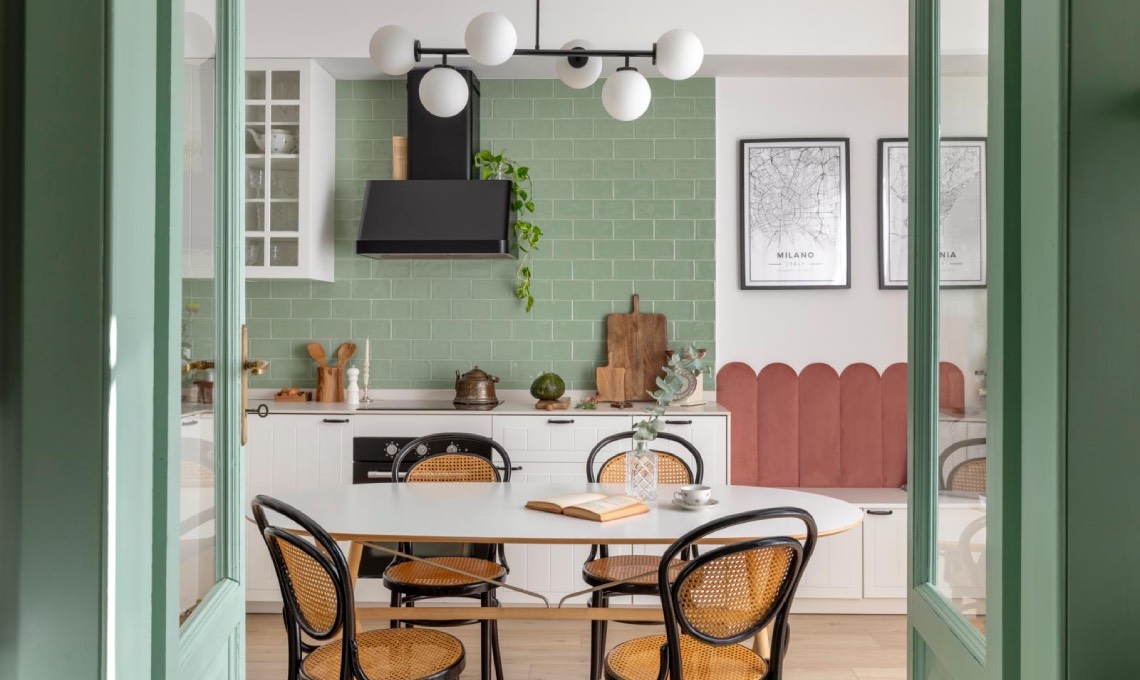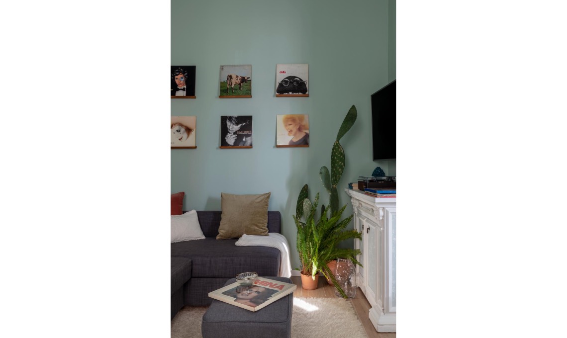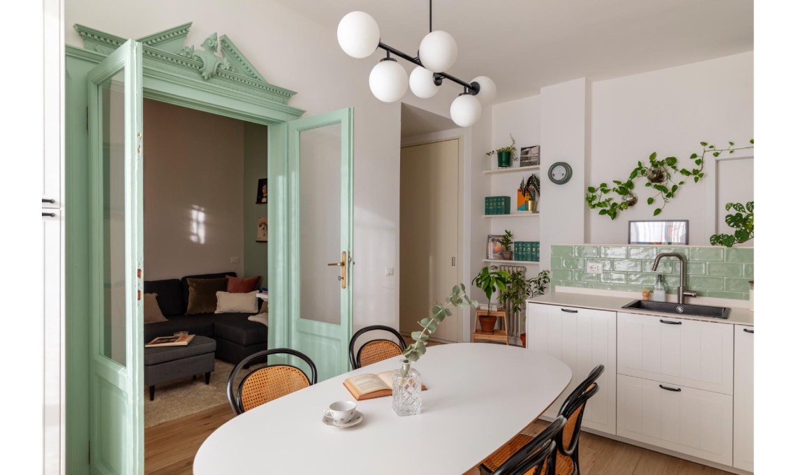 Gli elementi contemporanei si accostano a dettagli classici. Gli arredi vintage sono stati restaurati e la palette sfoggia un gusto rétro dove vince un luminoso verde salvia.