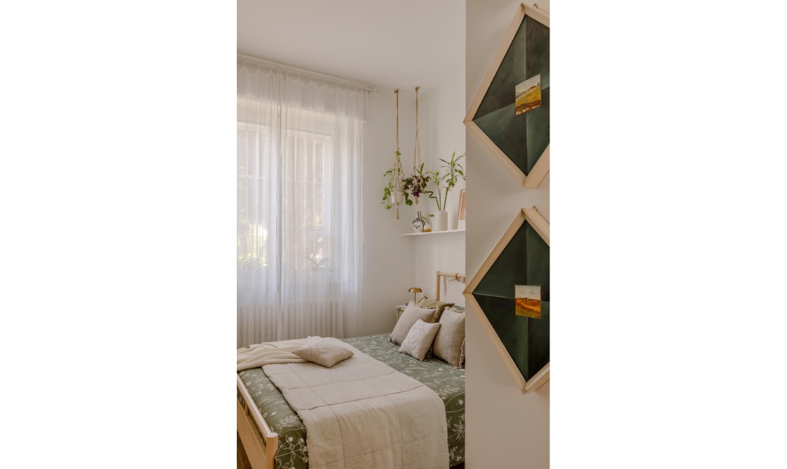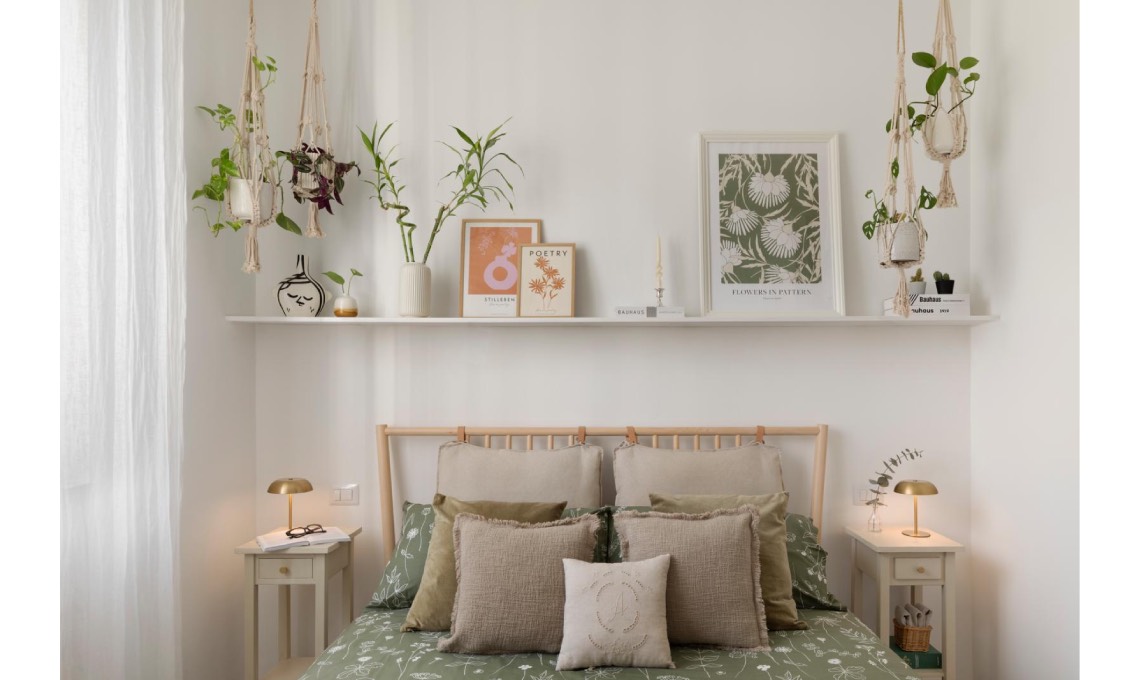 La stanza da letto è cozy e boho chic, con tante soluzioni: la mensola a scomparsa dipinta di bianco come la parete, i cachepot per le piante, le mini lampade. Letto Björksnäs [Ikea], lampade da tavolo Monocromatica Tattile colore ottone [Zara Home].