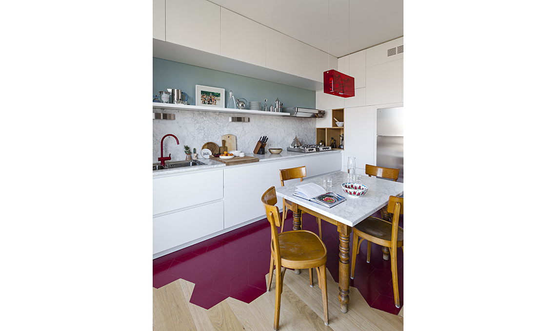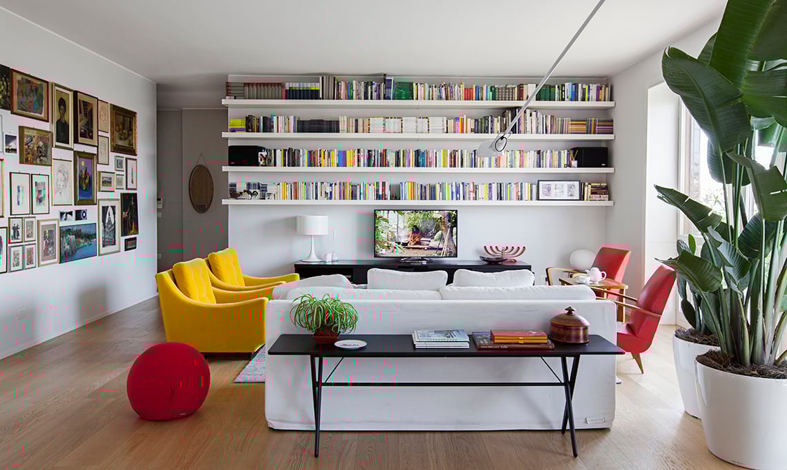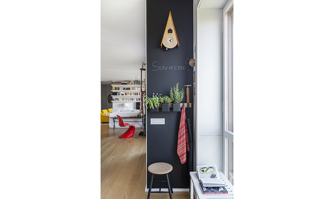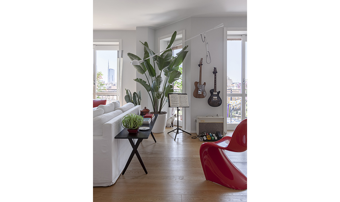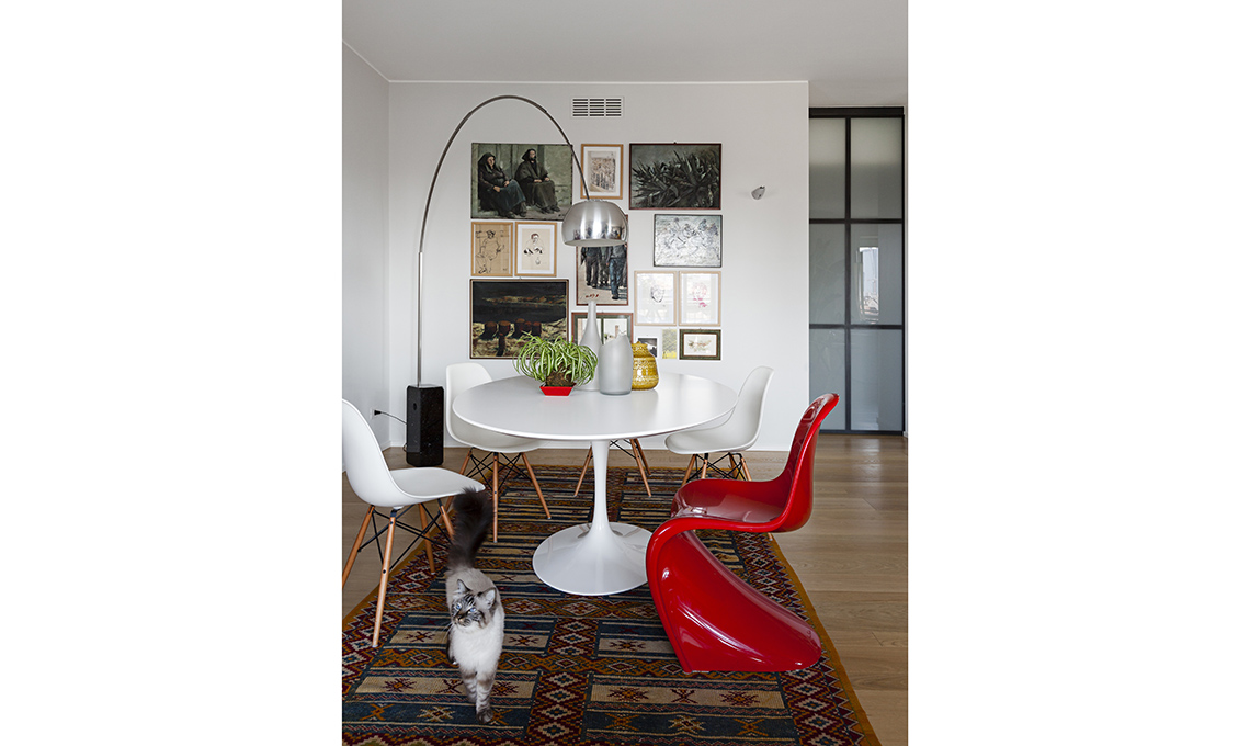 [Vitra €485 e €385] e la lampada da terra Arco [Flos €1.950]. Il tappeto marocchino è un ricordo di viaggio. Sedia rossa Panton Classic [Vitra