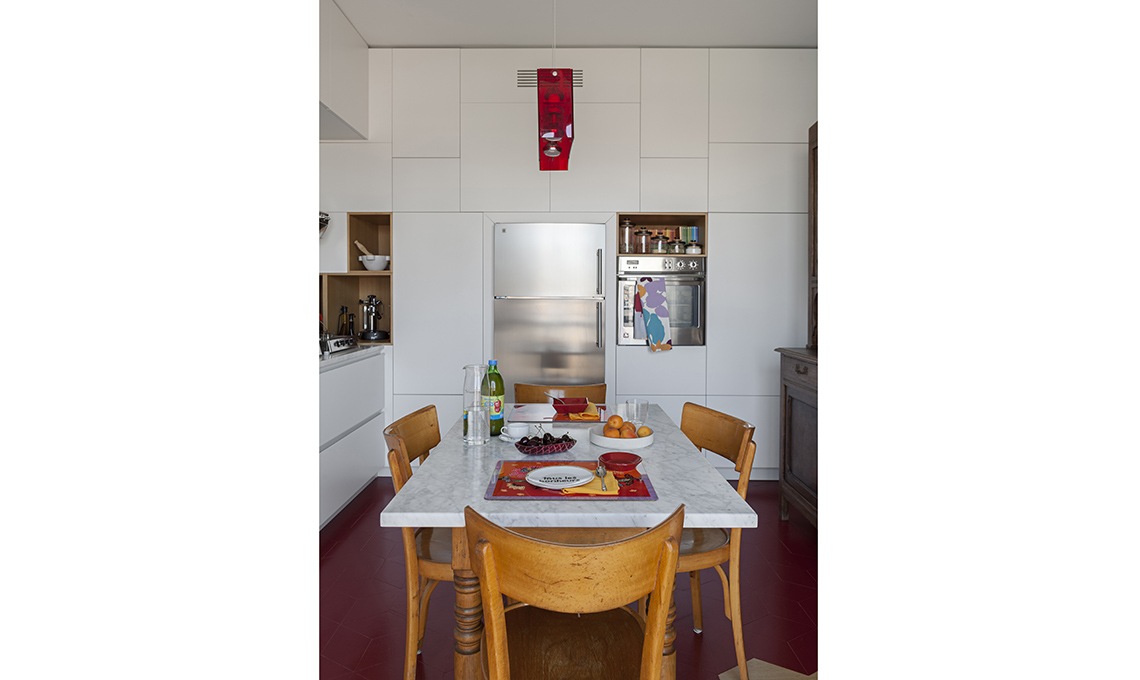 Frigo [General Electric] e forno [Alpes Inox] sono incastonati nella parete attrezzata disegnata da Isabella e prodotta da [Cesar]. Sospensione Duplex [FontanaArte €355], ad altezza regolabile e con emissione di luce verso l’alto e verso il basso.