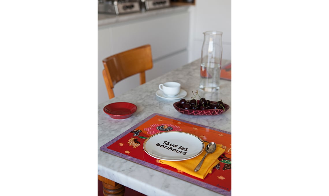 Tovaglietta e tovagliolo [Lisa Corti], piatto [Funky Table], caraffa [Muji], posate [Alessi].