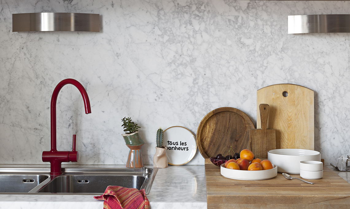 [Zucchetti], applique Riga [FontanaArte cm 36x7x7h da €185]. Sulla mensola, oggetti [Alessi]. Tavolo dei bisnonni di Isabella con piano in marmo. Sedie vintage [da Magazzino76]. Fuochi, cappa