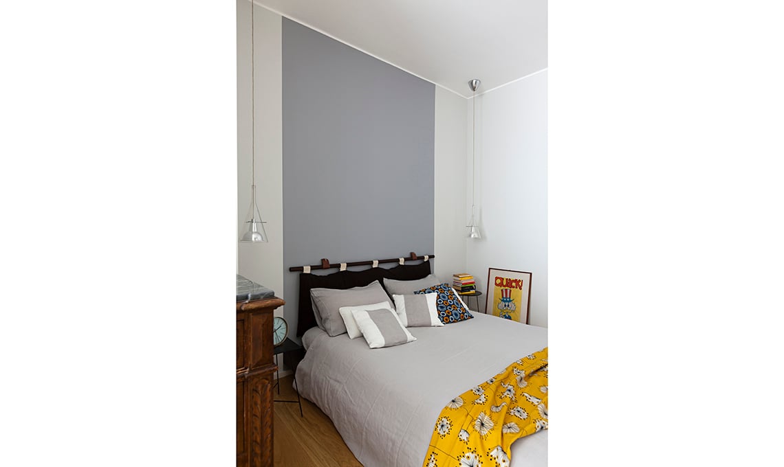 Nella camera padronale, la parete dietro il letto stile jap [Urushi] è di un bel grigio.