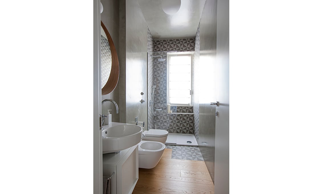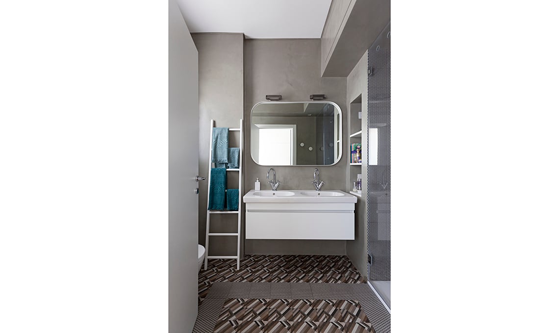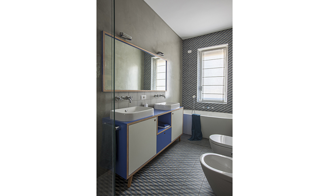 Piastrelle collezione Azulej di Patricia Urquiola [Mutina, da €150,57/mq]. Nel bagno dei ragazzi,piastrelle decoro Cubo, lavabi [Duravit] come i sanitari Starck 2 su mobile disegnato da Isabella; rubinetteria [Zazzeri], luci da parete Talo [Artemide], vasca [Bette].