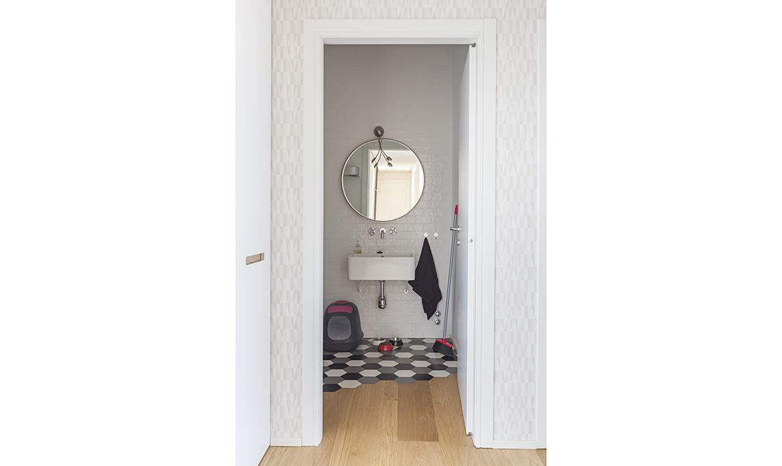 La lavanderia: lavello [Villeroy & Boch], specchio [Ikea]. A terra, piastrelle Examatt e a parete Silk [Tonalite €80,52 e €97,60 al mq].