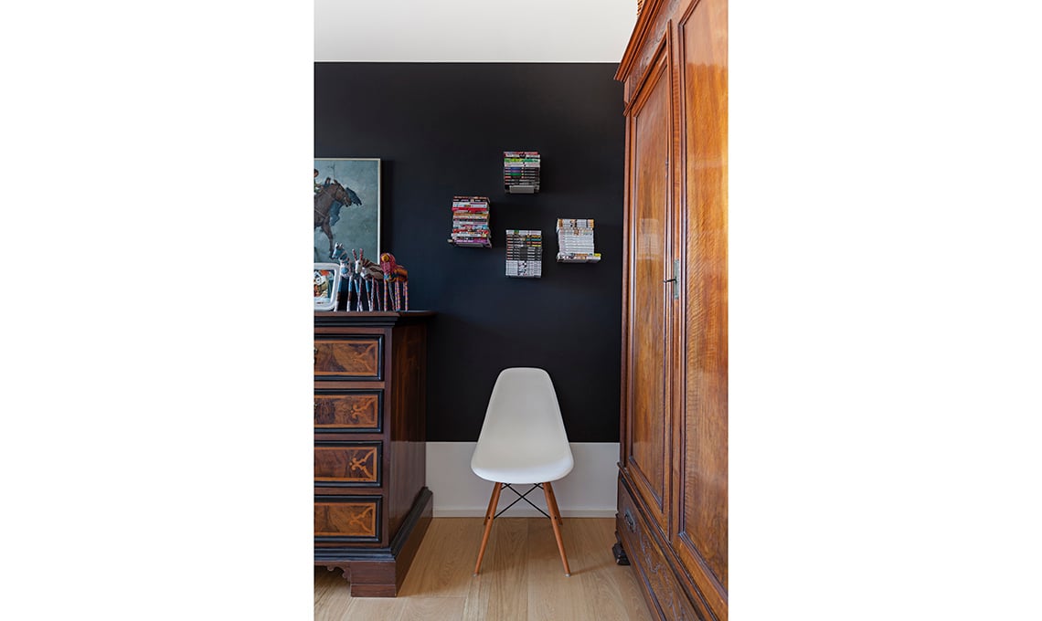 Cassettone d’epoca della nonna, come il guardaroba. Sedia DSW [Vitra]. A parete, vernice lavagna e mini mensole per libri [Monoqi €93 la coppia].