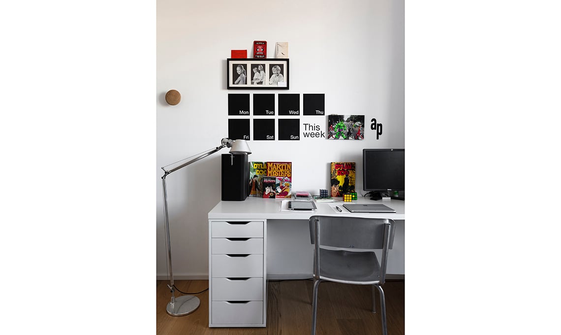 La zona-studio del figlio: scrivania [Ikea], lampada Tolomeo [Artemide], sedia vintage. Planner-lavagna [Monoqi].