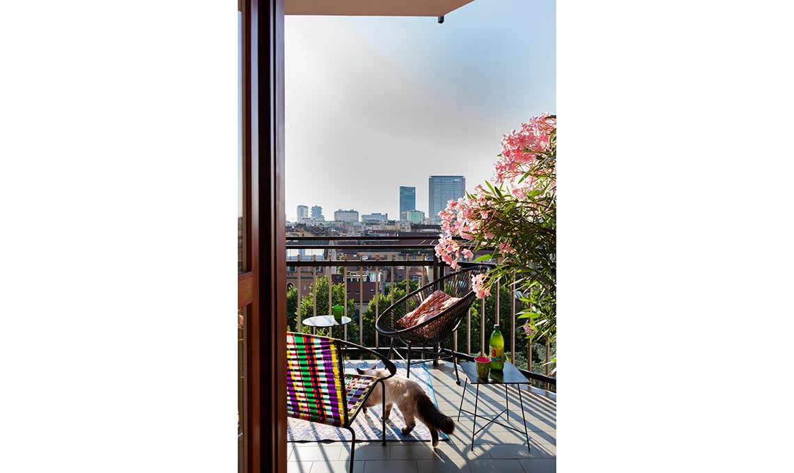Sul terrazzo, tavolini di Antonino Sciortino [Cargo], poltrona e divanetto da [Funky Table], come il tappeto.