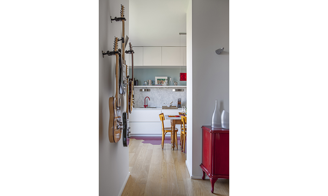 Sulla parete tra living e cucina, la collezione di chitarre elettriche del
