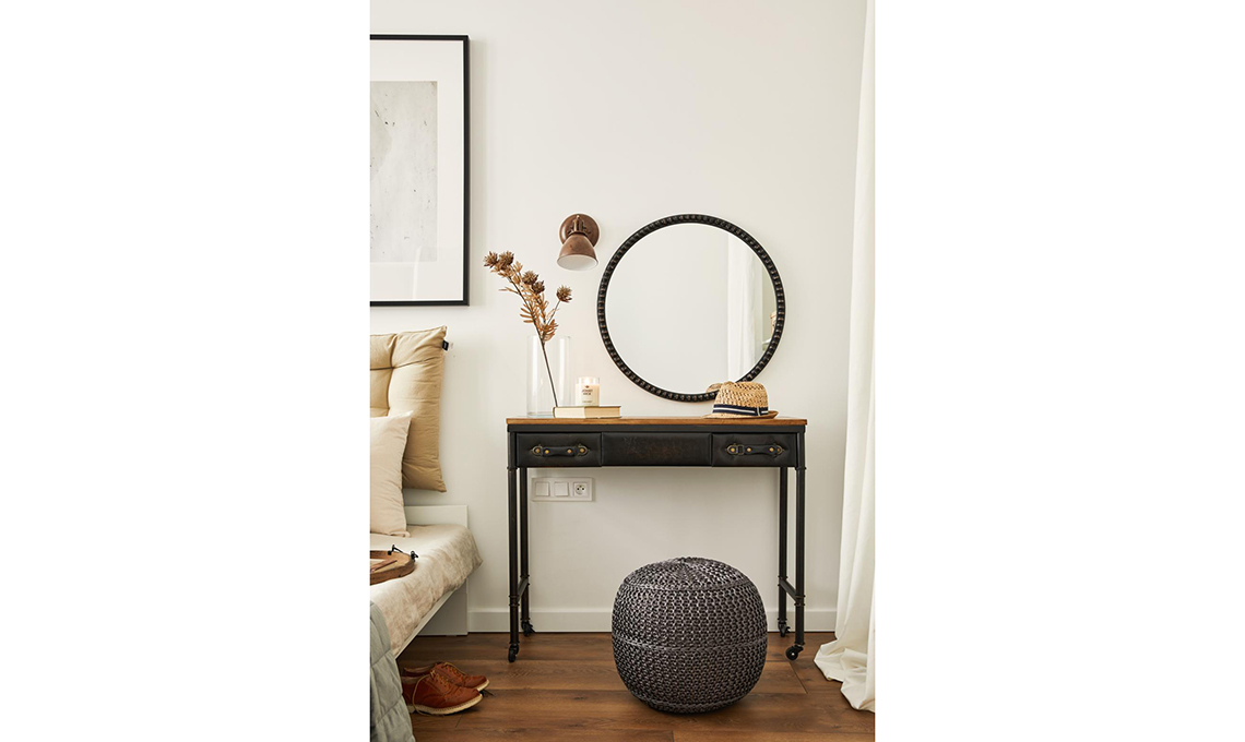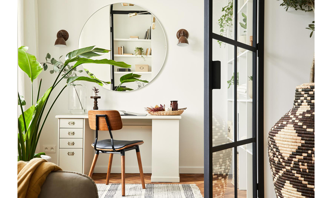lo studio sia la terza finestra». Scrivania Newport [Maisons du Monde, cm 150x70x77h], sedia Victoria [su it.nordlysfurniture.com], specchio rotondo senza cornice Erin [su westwing.it, ø cm 80].