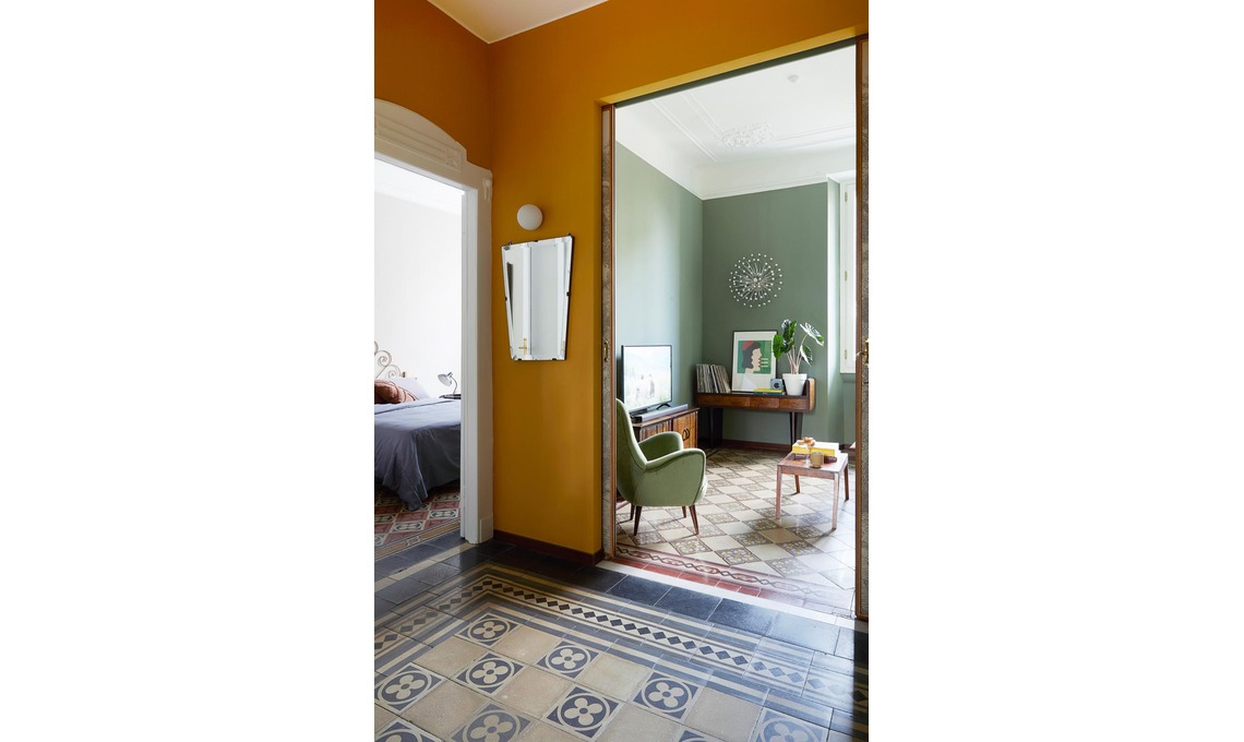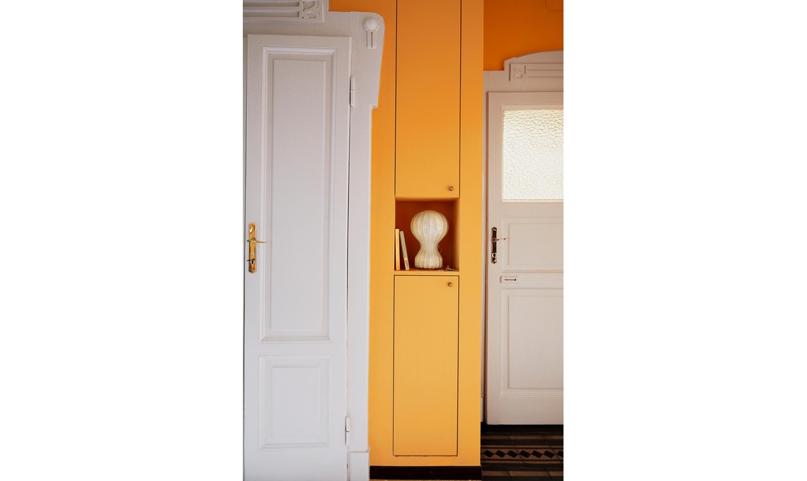 giallo ocra (ripreso dalle cementine della camera da letto) e ha fatto risaltare le porte di inizio Novecento con lo smalto bianco. Ha poi ricavato due nicchie funzionali: quella piccola chiusa da due sportelli nasconde impianti e quadro elettrico e ha un vano svuotatasche; quella grande, accanto al living, è stata trasformata in un armadio chiuso dalla vecchia porta del salotto.