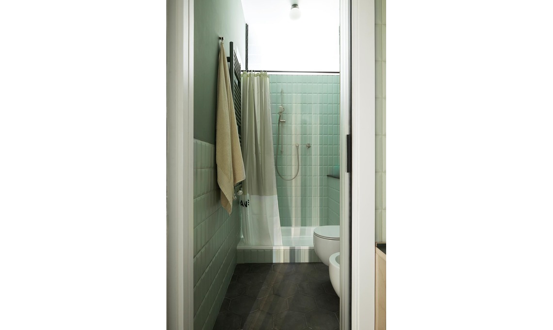 Il vecchio bagno lungo e stretto (solo 110 cm) è stato allargato rubando 30 cm alla cucina: nella prima parte (con ripostiglio in quota) è stato inserito il mobile lavabo, nella seconda i sanitari e la doccia da cm 140x80. Qui i colori si fanno tenui: le piastrelle diamantate sono color menta, soffitto e pareti verde polvere. Per avere la corretta pendenza degli scarichi i sanitari sono sospesi e si è realizzata una controparete finita con mensole in granito nero (lo stesso dell’alzata della cucina). Piastrelle a pavimento Terra esagonali nere [Marca Corona] e a parete Metro Edera diamantate [CE.SI.], idropittura Green Smoke 47 [Farrow & Ball], mobile bagno su disegno con lavabo da appoggio [Ceramica Cielo], rubinetto Volante [Neve], specchio Lindbyn e lampada Tertial [Ikea, ø cm 80].
