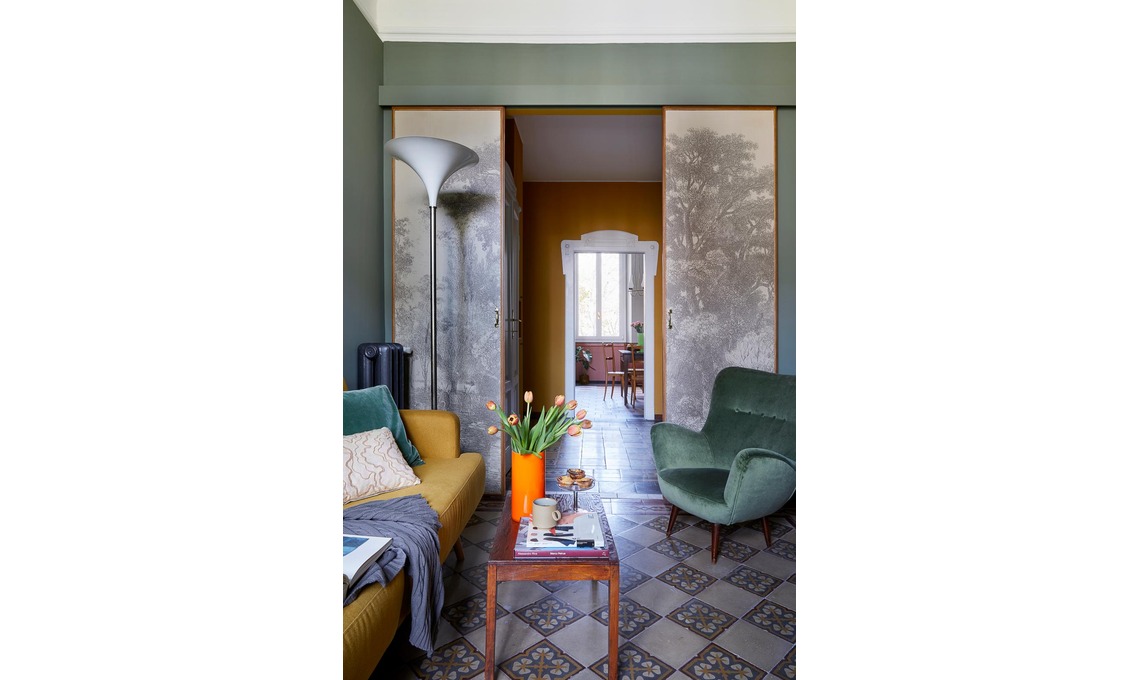 Le ante della porta scorrevole del salotto sono rivestite in carta da parati a tema paesaggio anche