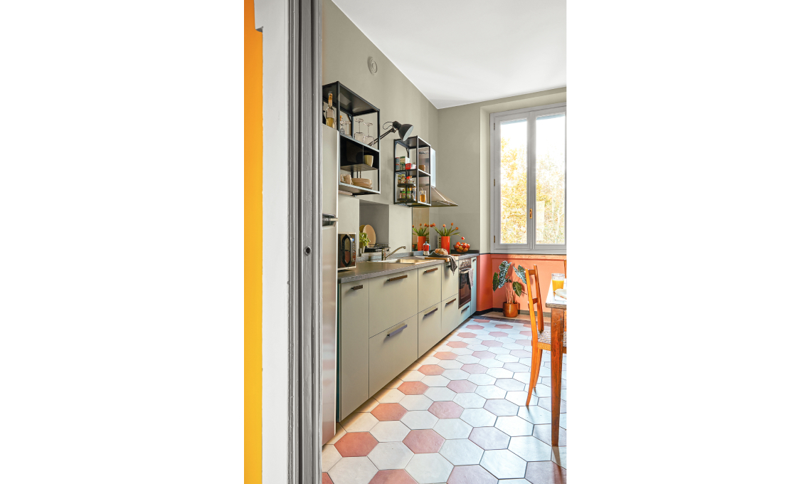 Il pavimento della cucina era rivestito in linoleum ed era rovinatissimo, così Mariapaola ha deciso di cambiarlo con piastrelle effetto cementine. Per lei il formato perfetto per dare carattere alle zone di servizio, ma senza eccedere, è quello esagonale e qui l’ha scelto in crema e terracotta partendo dalla nuance di quelle della camera; poi le ha completate con una fascia a mattonelle rettangolari nere come nel resto dell’appartamento.