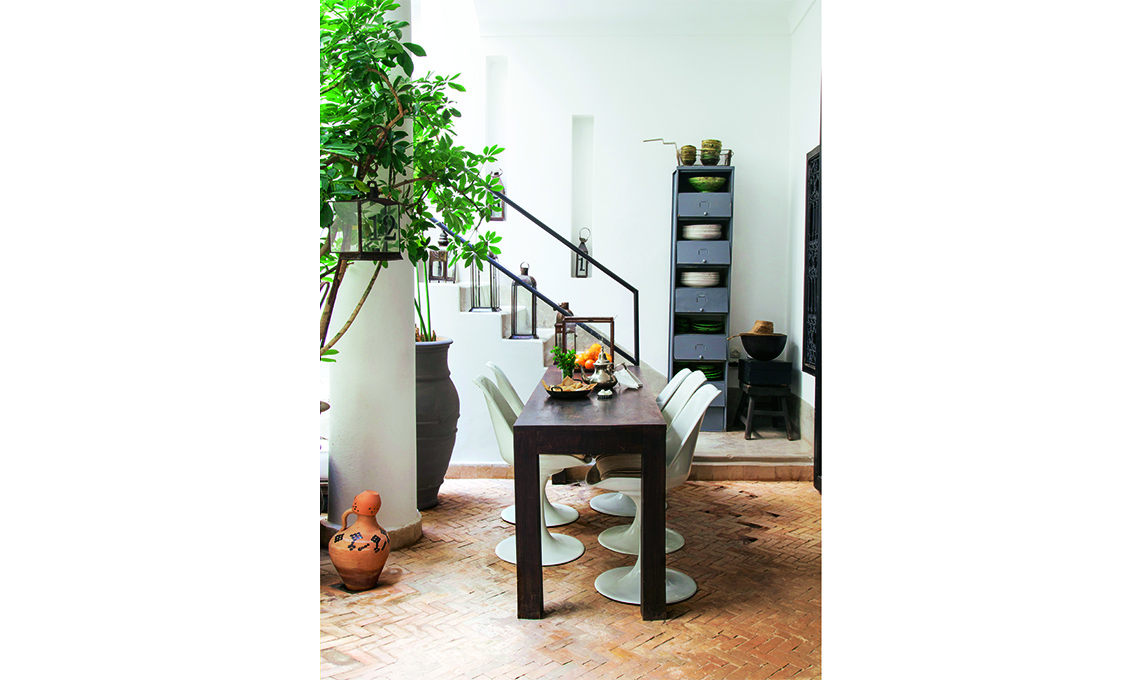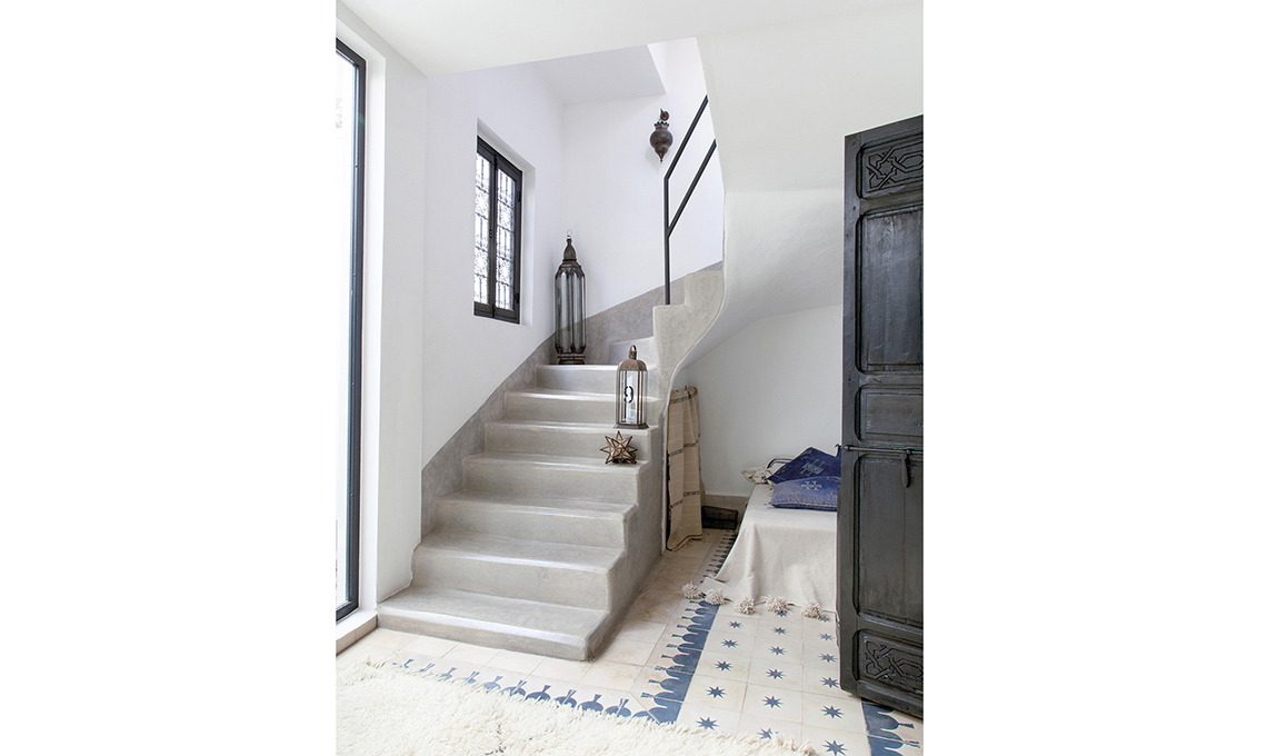 Pur mantenendo l'impostazione iniziale, decide di modificarlo per venire incontro alle sue esigenze. Oggi il riad è di 100 mq su tre livelli e presenta un bel miscuglio di architettura marocchina ed estetica industriale. La scala esterna conduce al primo piano, dove si trovano due suite e la terrazza con il caminetto.