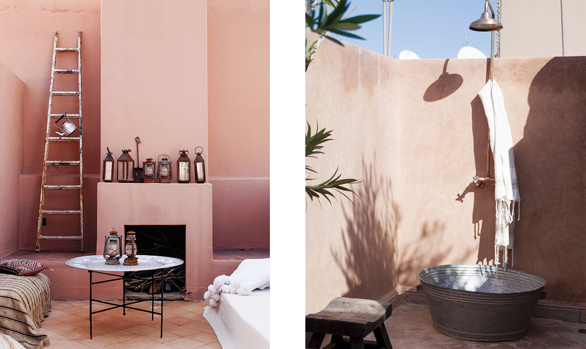 Mentre gran parte del Riad gioca su sovrapposizioni monocromatiche di bianchi, grigi e nero scaldate da legno e da pezzi di artigianato locale, l'esterno gioca con il colore. Coperte e cuscini trapuntati a mano, elementi in terracotta, legno o rafia, sentori metallici e colori terrosi nei toni del rosa. Se vuoi copiarlo, puoi ottenere un effetto simile con il rivestimento per pareti e pavimenti Petra, nella tonalità Alba 112 di Wilson&Morris.