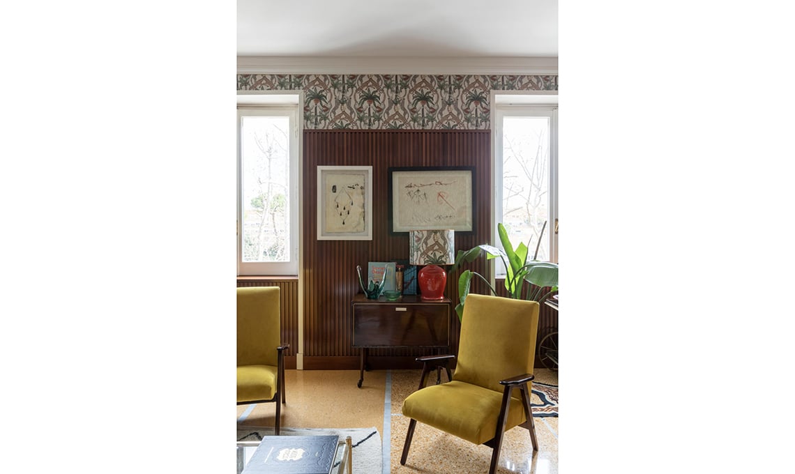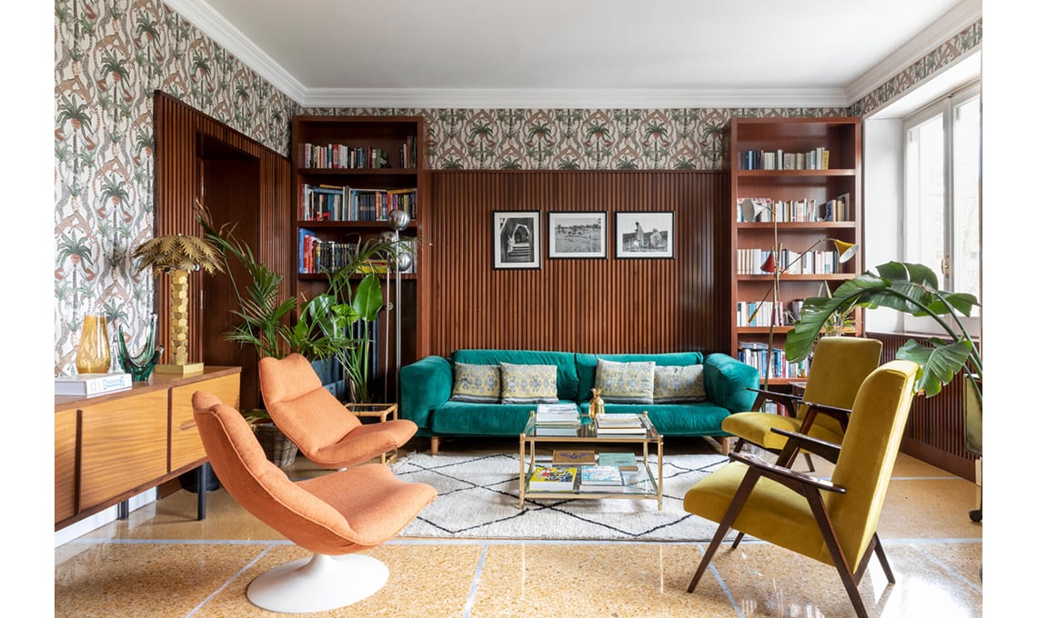 Prendi una casa Anni'60 con un'importante boiserie in legno: cosa fai? La risposta è stata: la metto in risalto con una carta da parati esotica che spiazza e aggiungo arredi della stessa epoca...