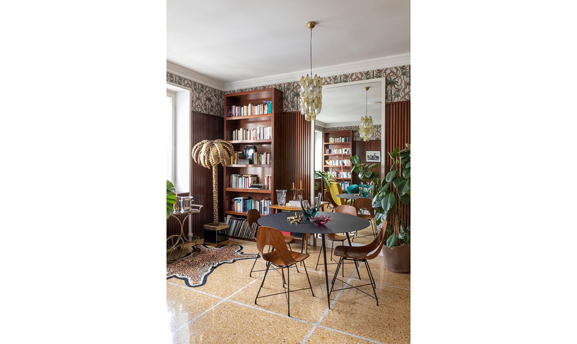 Tavolo [Extendo, da Galleria Mia], sedie Ariston di Augusto Bozzi per Saporiti, Anni ’50, da [Spazio Ampio], come il lampadario Poliedri, di Venini su disegno di Carlo Scarpa. Un tappeto-tigre? Tiger di [Rugvista], lampada a forma di palma su [viaantica.be].