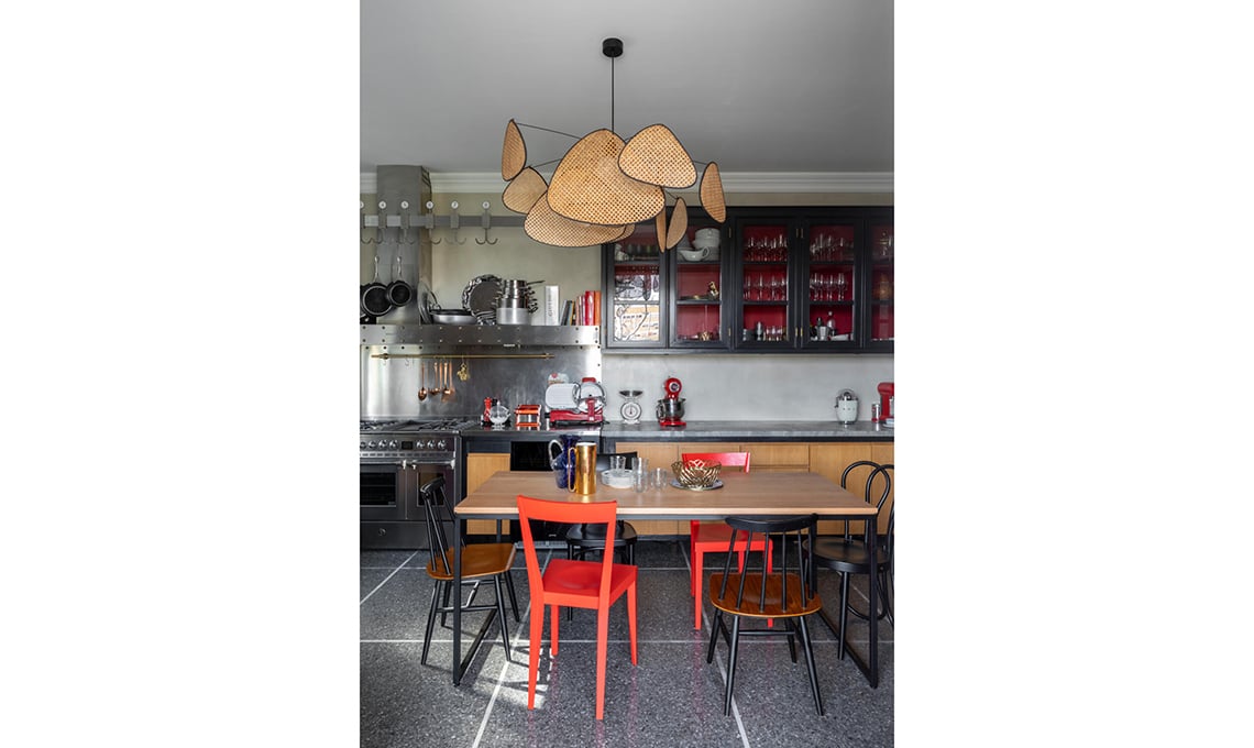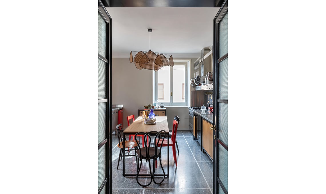 Dalla cucina, la porta a due battenti, ridipinta di grigio antracite, apre su un insieme optical: pavimento di cementine a scacchi e una fila di sospensioni in ottone. Oggetti sul tavolo [Bitossi Home], frigorifero Fab 38 [Smeg].