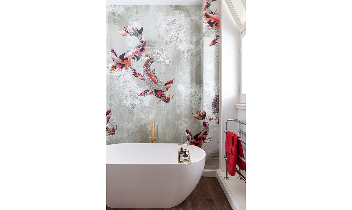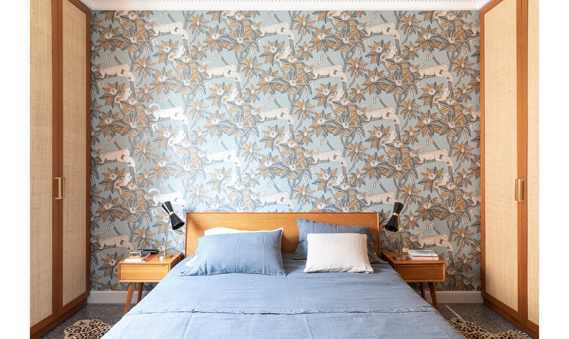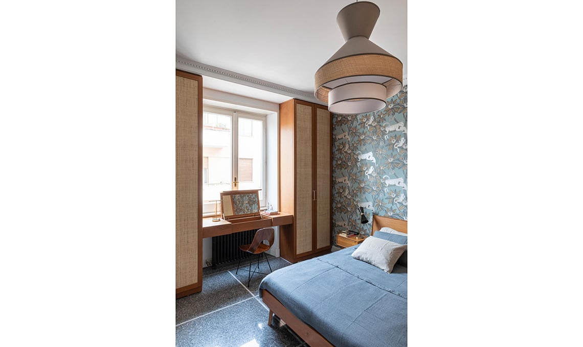 la carta a tema animalier e, per sfruttare meglio gli spazi, scompone l’armadio principale in più armadi, fatti realizzare su misura e con le ante rivestite in paglia, che contrasta con il legno più scuro.