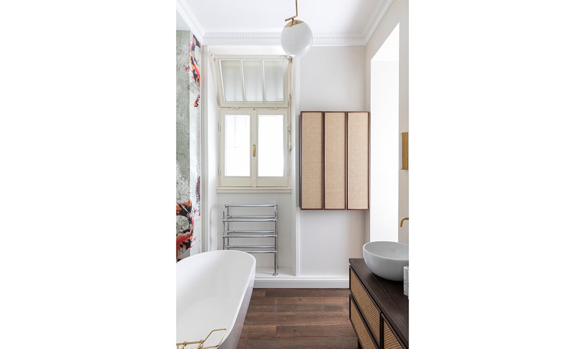 Bisognava inserire una doccia, una vasca e un mobile con due lavabi, quindi Cristina ne ha disegnato uno su misura, prevedendo degli inserti in paglia di Vienna e due bacini dalle dimensioni contenute. Mobili su disegno di Cristina Gigli, realizzati dalla falegnameria [Teknocoop Wood Design Solutions], lavabo Shui [Ceramica Cielo], luci [Piccola Bottega].
