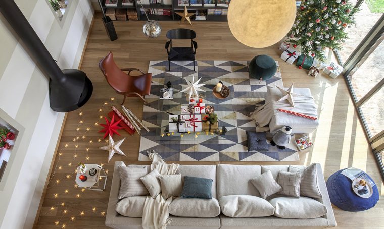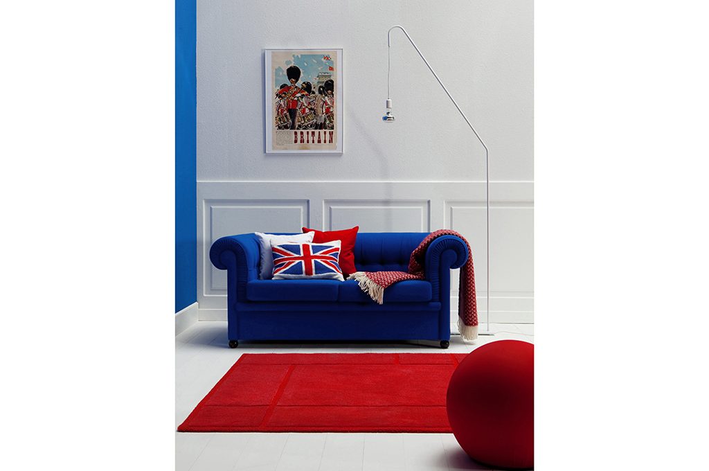 Il rosso è ideale se vuoi dare un tocco ironico alla stanza, giocando per esempio con una bandiera... Tappeto Karl di Kashtall, cuscini di Inthema, plaid Gant, pouf Cerruti Baleari