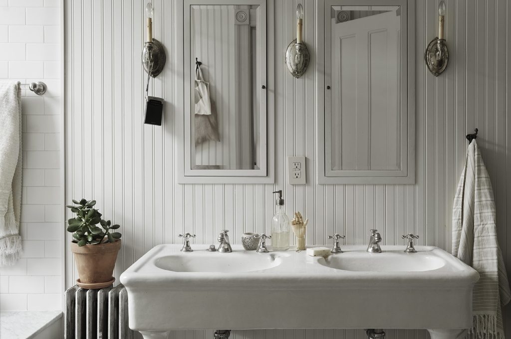 Lavabo consolle, con due bacini, simile a Paolina [su sellidesigner.it €850]; piastrelle old style, boiserie e calorifero simile a Tiffany in ghisa [Scirocco H]