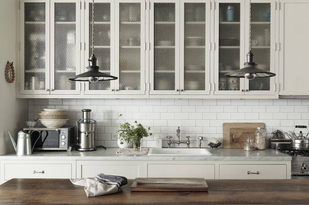 In cucina, bancone con top in noce, lampade industrial (tenute basse) e pensili costruiti intorno a vetri stampati di recupero, della stessa epoca della casa