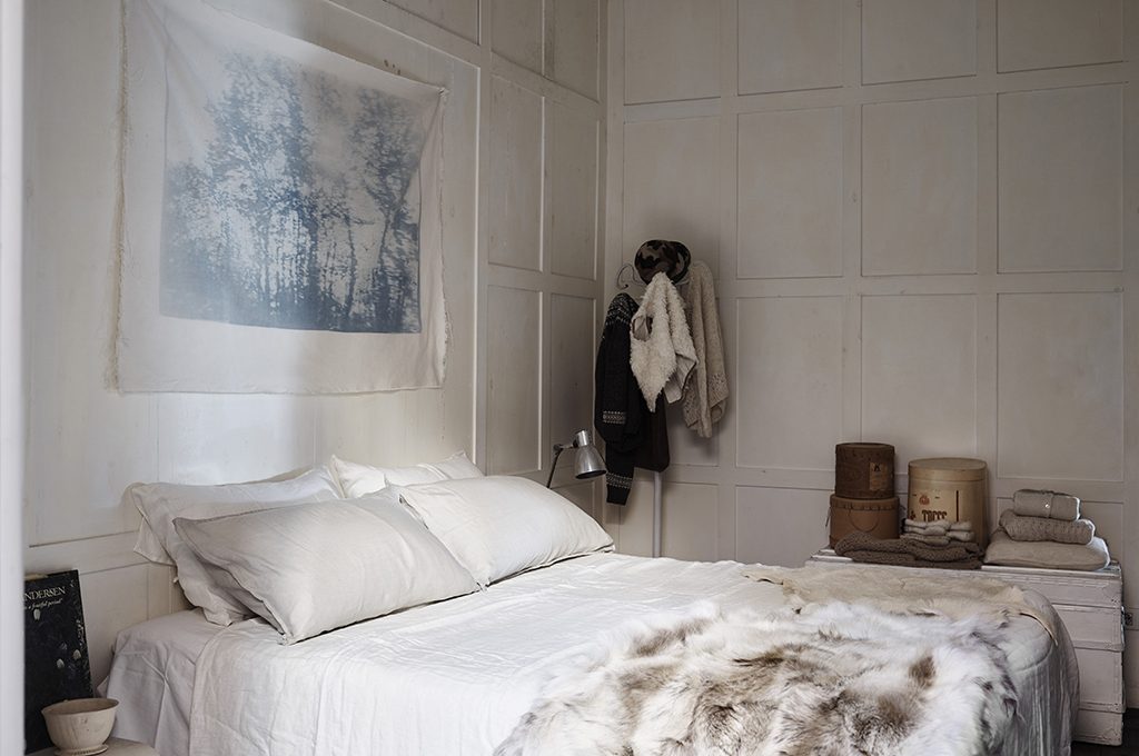 In camera da letto domina il bianco. Per il letto, la biancheria è di [Borgo delle Tovaglie]. Una cianotipia su tela di cotone decora la parete sopra il letto.